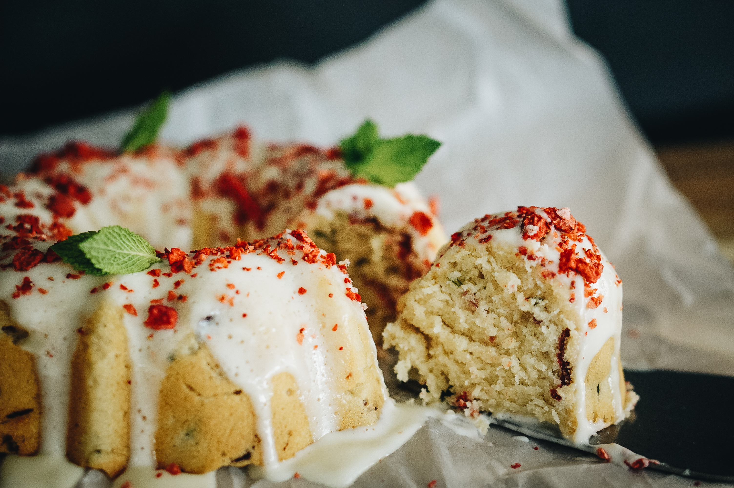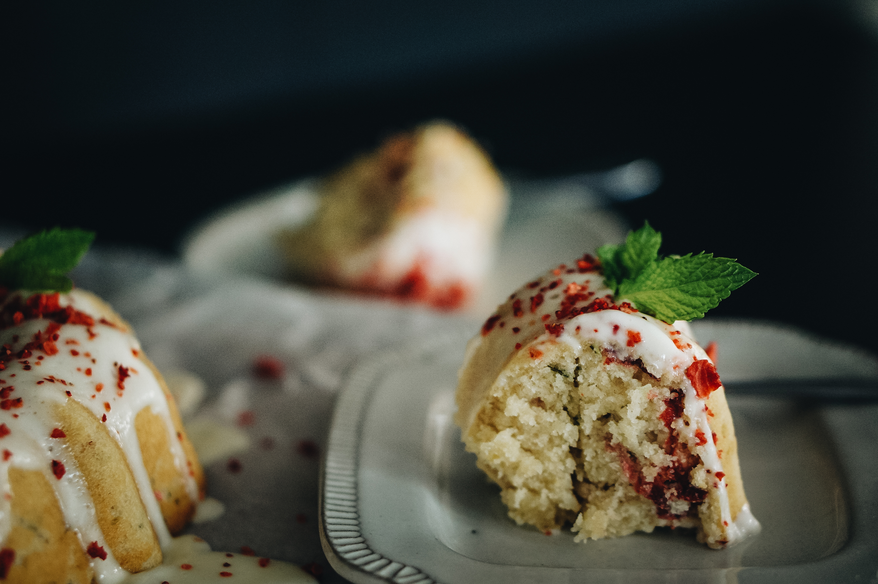 I finally found some deeply buried creative desires the other day and started to crave a fruity and citrusy dessert. I recalled a Treat of the Month I did once called Bundtinis, where I made small bundt cakes that had different fruits and booze in it. My fave out of the bunch was the blueberry mojito. The tartness of the lime and blueberries paired perfectly with the sweetness of the white chocolate drizzle! I remembered I had freeze-dried strawberries and nothing could stop me!